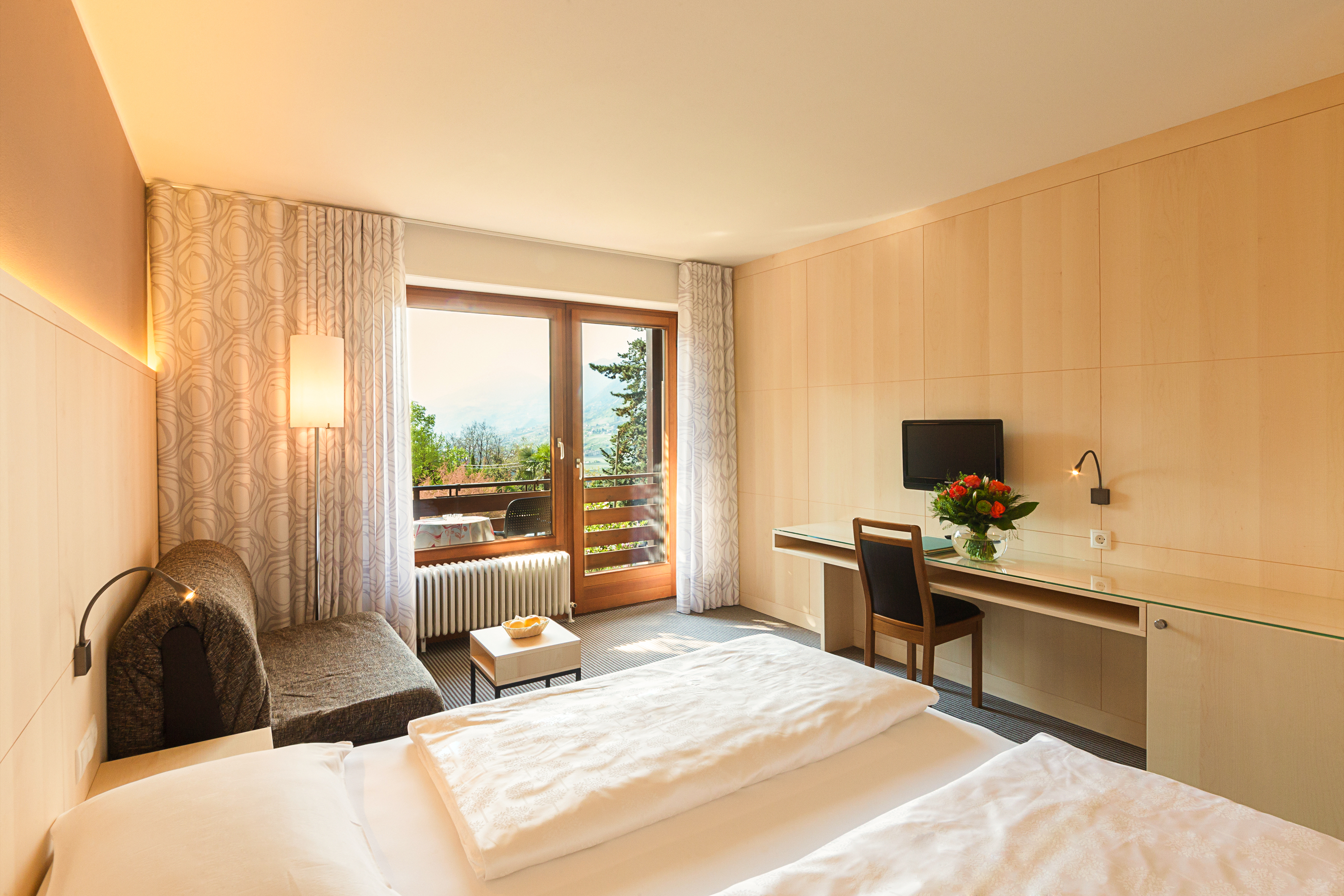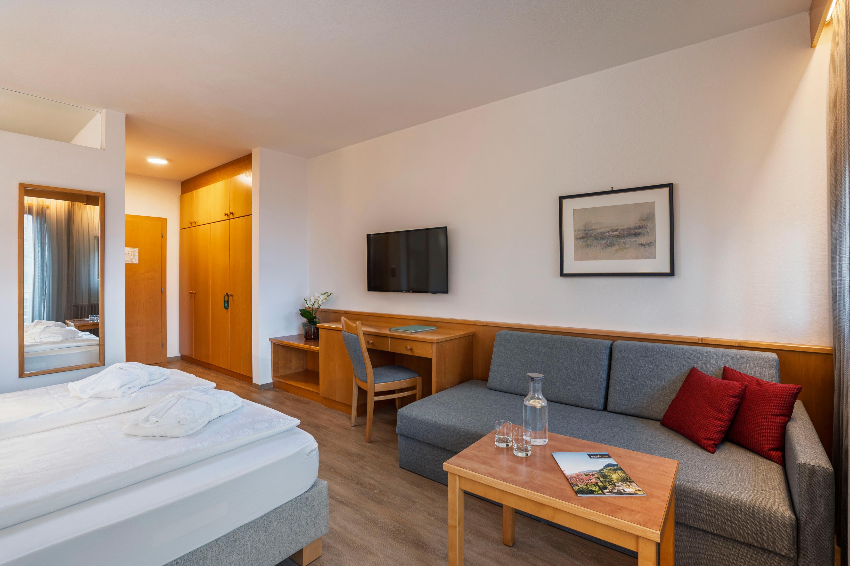 Komfortdoppelzimmer mit Dusche, WC, Fön, Telefon, Flachbildschirm mit Digital-TV, Zimmertresor, Sitzcouch, mit Verbindungstür zum Komforteinzelzimmer mit ausziehbarer Couch, Dusche, WC, Fön, Telefon, Flachbildschirm mit Digital-TV, Zimmertresor, Südbalkon.